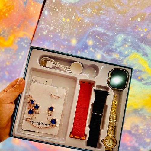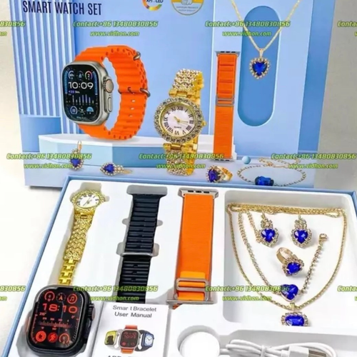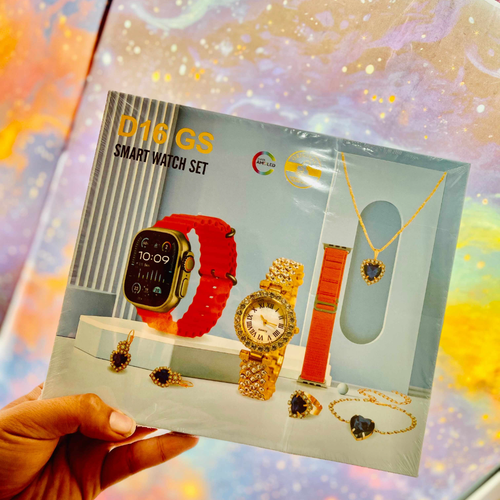 هوشمند d16gs پک2تایی ساعت هوشمند با گردنبد و انگشتر و گوشواره و دستبند و ساعت زنانه طلایی